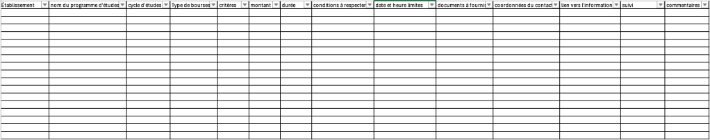Si vous avez déjà une offre d’admission acceptée, commencez avec la colonne type de bourses. Sinon, ce tableau pourrait vous être d’une précieuse aide pour prendre votre décision quant au choix d’établissement et de programme d’études si l’aspect financier est un facteur déterminant.