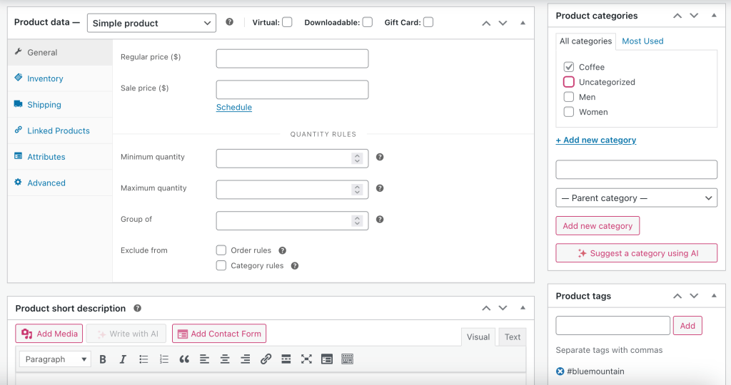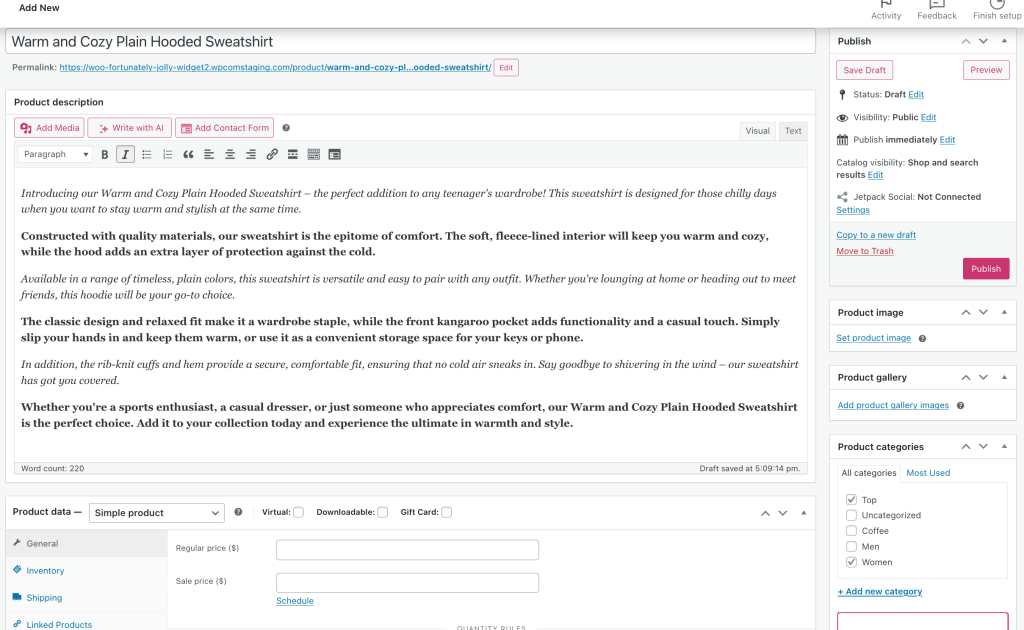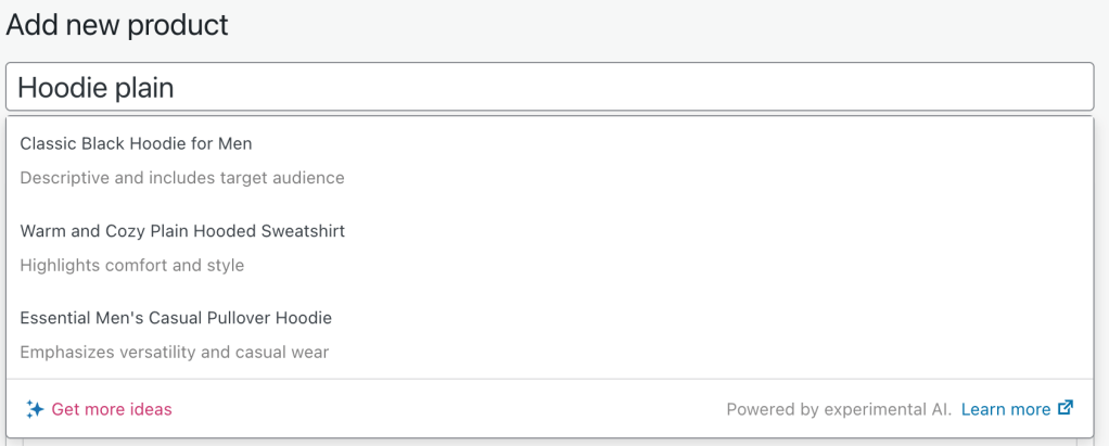 Tant pour le nom du produit que sa description, la fonctionnalité de l’assistant AI est très pratique pour les débutants et pour ceux dont la rédaction n’est pas une force. Il faut tenir compte de plusieurs détails dans la création des fiches produits. Ce qui n’est pas une mince tâche si votre inventaire comporte beaucoup d’articles différents ou de variété d’un même produit. Cette étape prend donc un temps considérable, mais le résultat du temps investi se reflètera dans la qualité du site.