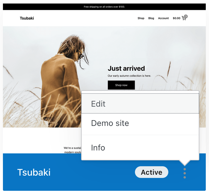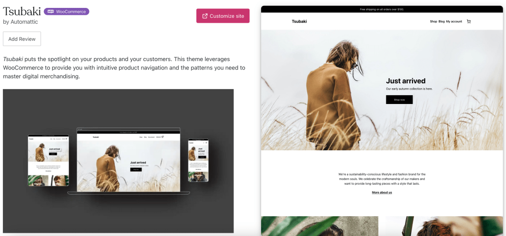 Pour ma part, j’ai choisi le thème gratuit Tsubaki pour les besoins de l’exercice. En cliquant sur Demo site, il est possible de visualiser ce qu’aura l’air la boutique une fois construite selon le medium choisi pour consulter le site (laptop, tablette, cellulaire). Cela permet d’ajuster en amont le contenu et les images afin que l’expérience-client soit plaisante peu importe l’appareil utilisé.