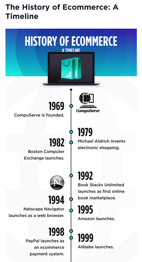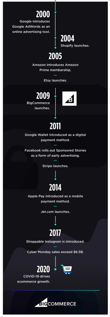 Voici une image qui représente bien l’historique du commerce électronique tirée du site Big Commerce