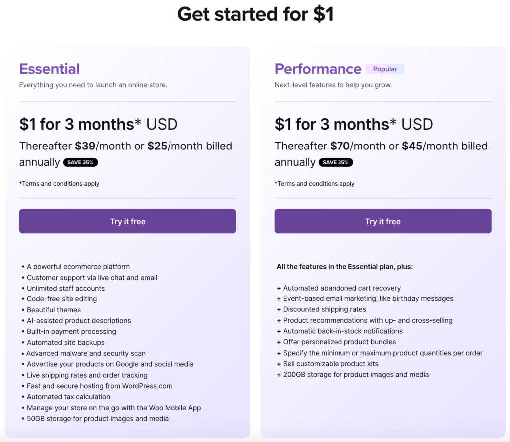 Que vous choisissiez le plan Essentiel ou Performance, ils offrent tous les deux un essai gratuit de 14 jours avec Woo Express.