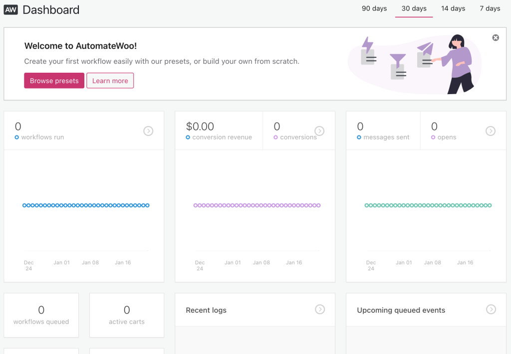 AutomateWoo permet de configurer et de gérer le tableau de bord pour surveiller le trafic et comprendre ce qui se passe sur le site, dans l’optique de personnaliser les communications et les efforts marketing.