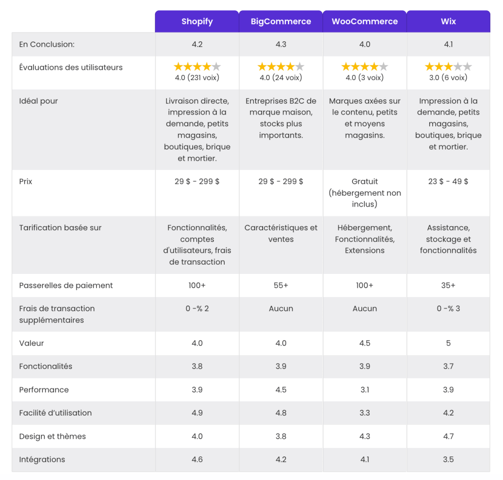 Ces catégories comprennent la tarification, le service et le support, les outils de création de site, le traitement des paiements et la comptabilité, les fonctionnalités de commerce électronique, ainsi que l’évaluation d’experts.