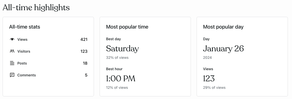 La statistique du jour le plus populaire est faussée par mes nombreuses visites pour ajuster certains paramètres entre le 26 et le 27 janvier. Il aurait fallu que je prenne une capture d’écran le 25 janvier pour avoir un aperçu qui illustre plus justement la situation.