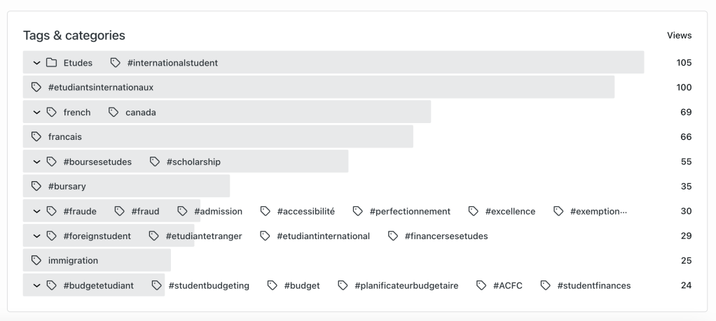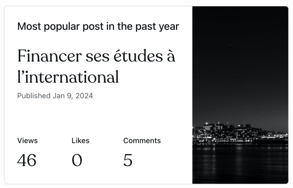 L’article sur le budget étudiant pour financer ses études à l’international s’est avéré être le plus populaire. Ce qui n’est pas surprenant considérant que c’est l’article que j’ai choisi de promouvoir pour faire connaître la série. Les efforts de promotion ont donc eu un effet direct sur le nombre de vues.
