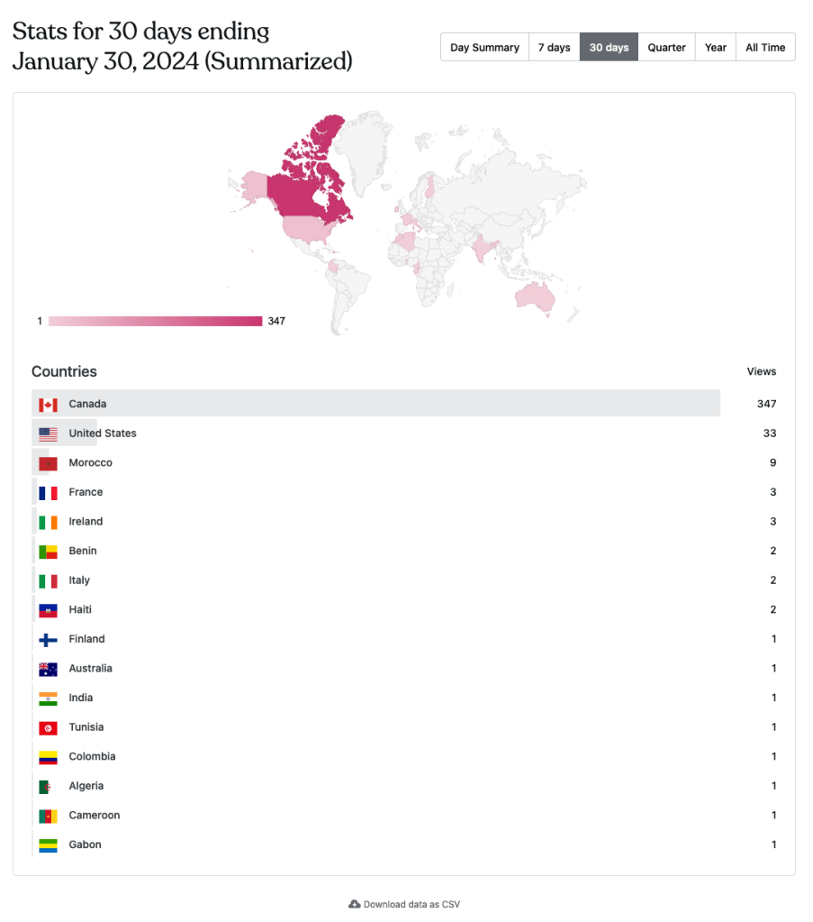 La plupart des visiteurs proviennent du Canada, et des États-Unis, grâce aux tweets sur X, entre autres. Il a aussi été intéressant de voir que les efforts de promotion sur les groupes Facebook destinés à la communauté étudiante internationale ont porté fruits en rejoignant des personnes de pays francophones sur d’autres continents.