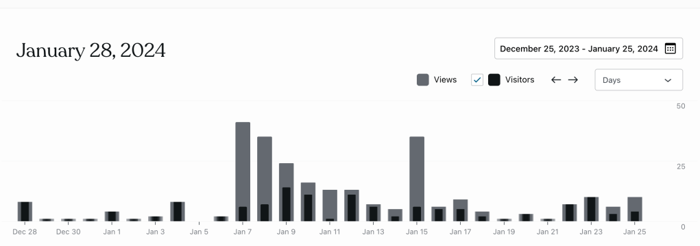 Le nombre de vues et de visiteurs sont directement proportionnels aux dates de parution et de partage des liens vers les articles. En date du 26 et du 27 janvier, j’ai fait plusieurs modifications et tentatives d’indexation et de partage sur différents médiums en plus d’ajouter les liens internes sur chaque article de la série. Ce qui fausse les statistiques de visites puisque le résultat reflète en grande partie mes clics.