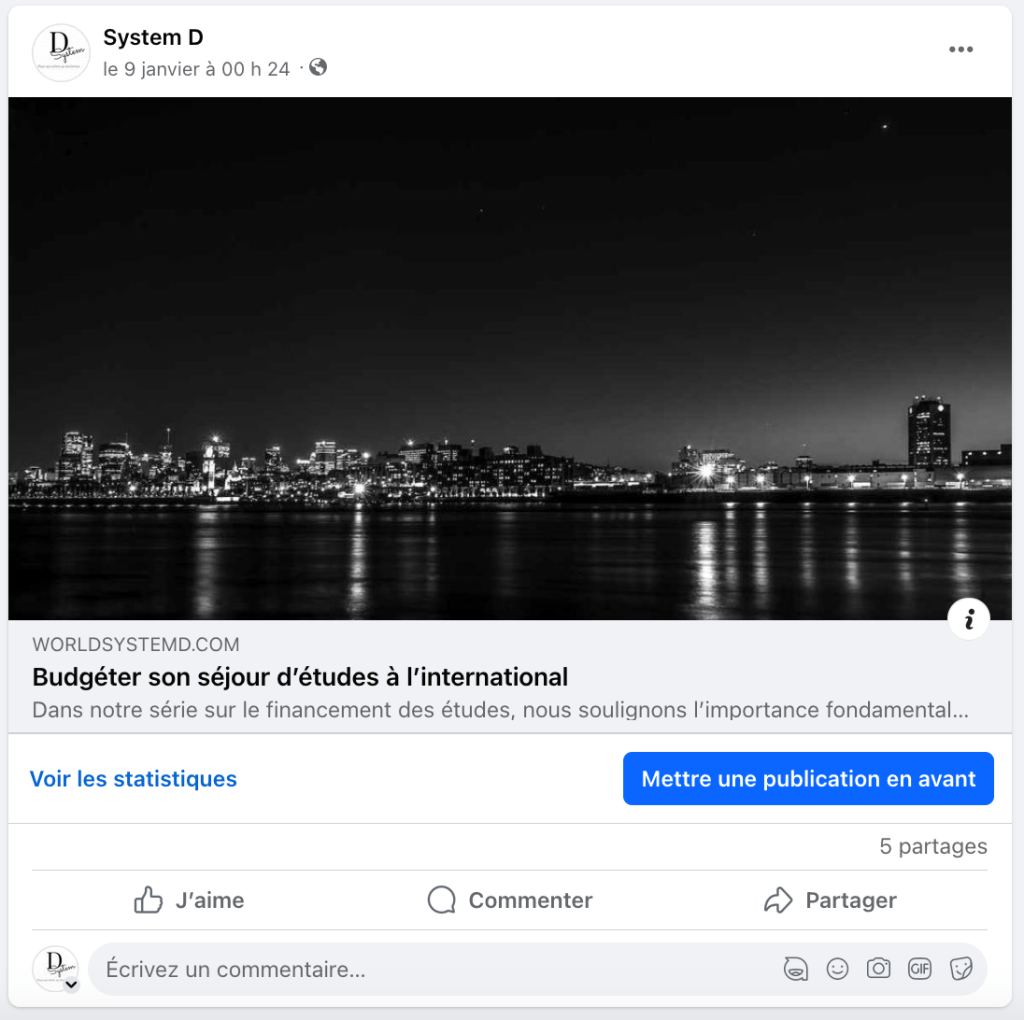 L’adhésion à plusieurs groupes privés discutant des sujets de financement des études à l’étranger ont permis le partage des articles les plus pertinents selon l’angle des discussions sur les groupes. Par exemple, l’article sur le budget a été partagé avec le thème financer ses études à l’étranger ou études au Canada, alors que ceux sur les bourses ont été publiés dans les groupes nommés Bourses d’études, et ainsi de suite. Cet exercice a rejoint des lecteurs de partout dans le monde.