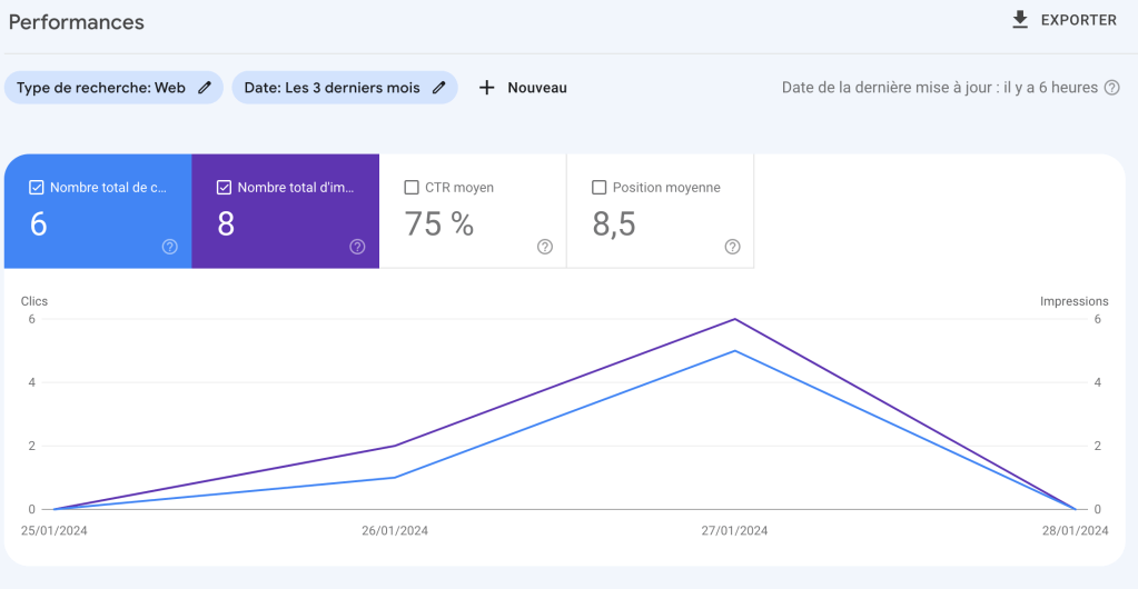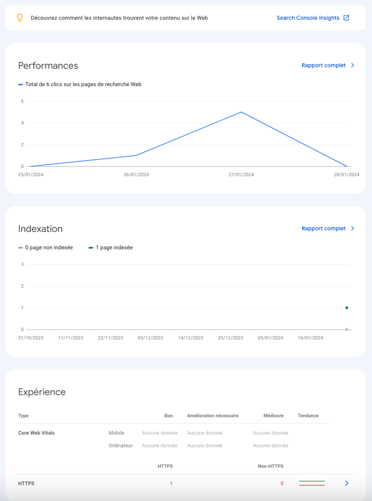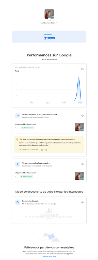Pour des outils de référencement SEO optimisés, il me fallait adhérer au forfait Creator de WordPress. J’en suis resté à la version de base. Une attention particulière a été portée à l’intégration de mots clés naturellement dans chaque article tout en suivant les techniques proposées et Techniques de référencement web de Martin et al. (2015) pour le référencement SEO. Ayant encore peu d’expérience dans le domaine, mes articles n’ont pas atteint une position dans les résultats des moteurs de recherche leur permettant d’être vus par un grand nombre de personnes, malgré l’utilisation des mots clés. La console de recherche Google permettra de suivre les performances futures des recherches faites directement sur le moteur. À ce jour, il y a eu très peu d’action comme on peut le constater sur les captures d’écran suivantes :
